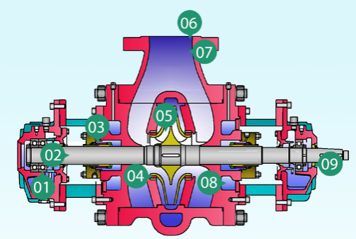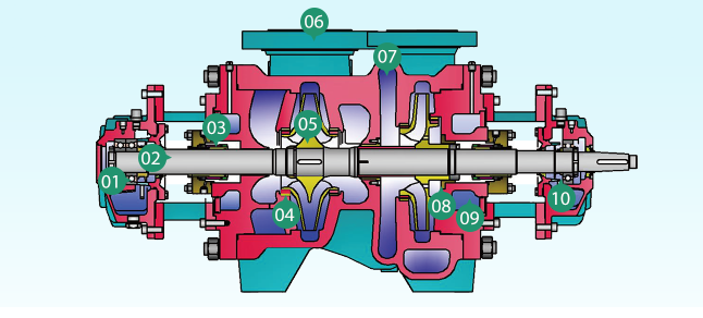 5.葉輪有單級雙吸和單級單吸。采用雙吸結(jié)構(gòu),汽蝕性能好,無水力軸向力,可用于各種高、低壓工況,可確保軸承使用壽命。